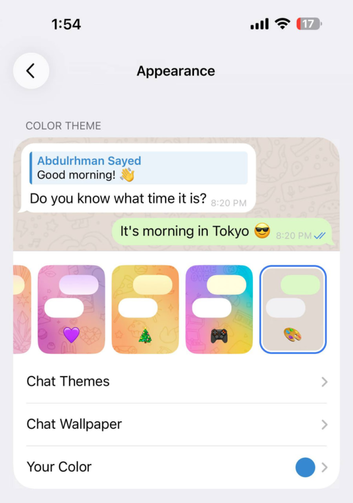 iPhone doesn’t use the same theme files as Android/Desktop, but you can still get a “theme look” using Appearance + Accent color + Chat background. I listed the best iOS-style combos below.