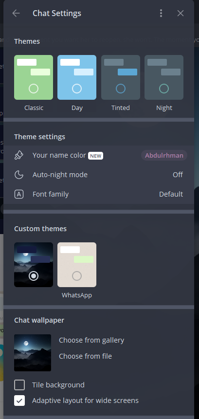 (Menu names can vary slightly by Telegram version, but “Chat Settings” and “Chat Background” are always the idea.)